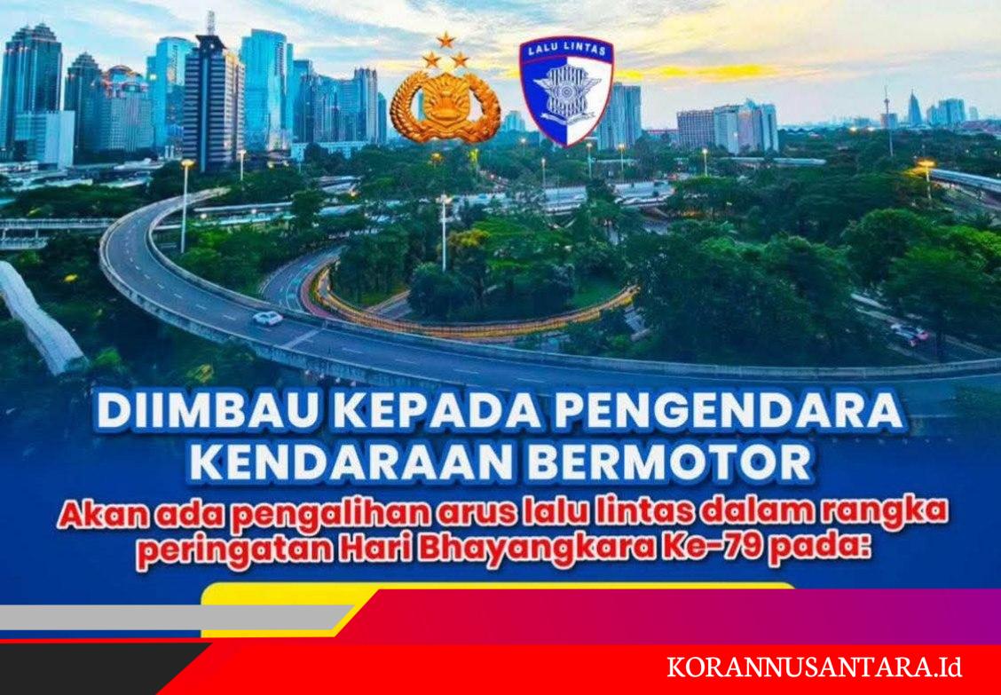Korannusantara.id – Jakarta, 30 Juni 2025, Dalam rangka memperingati Hari Bhayangkara ke-79, Kepolisian Republik Indonesia akan melakukan pengalihan arus lalu lintas di sejumlah titik strategis di DKI Jakarta pada Senin, 1 Juli 2025. Pengalihan ini akan dimulai sejak pukul 05.00 WIB hingga malam hari, demi mendukung kelancaran rangkaian acara peringatan yang dipusatkan di sekitar kawasan Monas dan Lapangan Banteng.