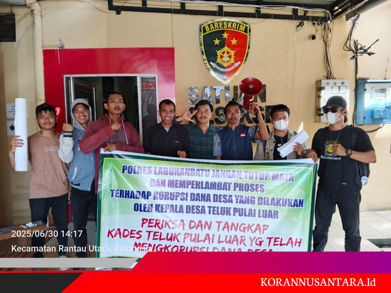 Korannusantara.id – Labuhanbatu Utara, Puluhan mahasiswa dan pemuda yang tergabung dalam Persatuan Mahasiswa dan Pemuda Labuhan Batu Raya (PM PELA RAYA) menggelar aksi unjuk rasa di depan Mapolres Labuhanbatu, sebagai bentuk protes terhadap lambannya penanganan kasus dugaan korupsi Dana Desa di Teluk Pulai Luar, Kecamatan Kualuh Ledong, Kabupaten Labuhanbatu Utara (Labura).(1/7)