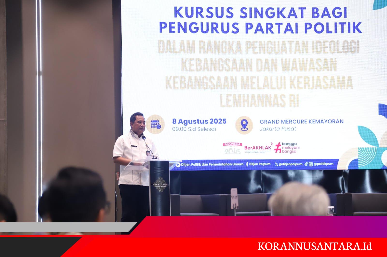 Korannusantara.id – Jakarta, Direktorat Jenderal (Ditjen) Politik dan Pemerintahan Umum (Polpum) Kementerian Dalam Negeri (Kemendagri) bekerja sama dengan Lembaga Ketahanan Nasional (Lemhannas) RI menggelar kursus singkat bagi para pengurus Dewan Pimpinan Pusat (DPP) partai politik (parpol). Kegiatan bertajuk “Peran Partai Politik dalam Mewujudkan Indonesia Sejahtera, Maju, Bersatu, dan Berdaulat” tersebut berlangsung di Hotel Mercure Jakarta Pusat, Jumat (8/8/2025).