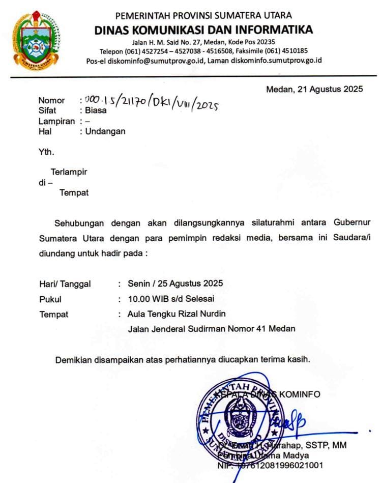 Medan,Korannusantara.id – 21 Agustus 2025 Pemerintah Provinsi Sumatera Utara (Pemprov Sumut) melalui Dinas Komunikasi dan Informatika (Diskominfo) secara resmi mengundang para pimpinan redaksi media untuk menghadiri acara silaturahmi bersama Gubernur Sumatera ( Gubsu ) Utara Bobby Nasution.