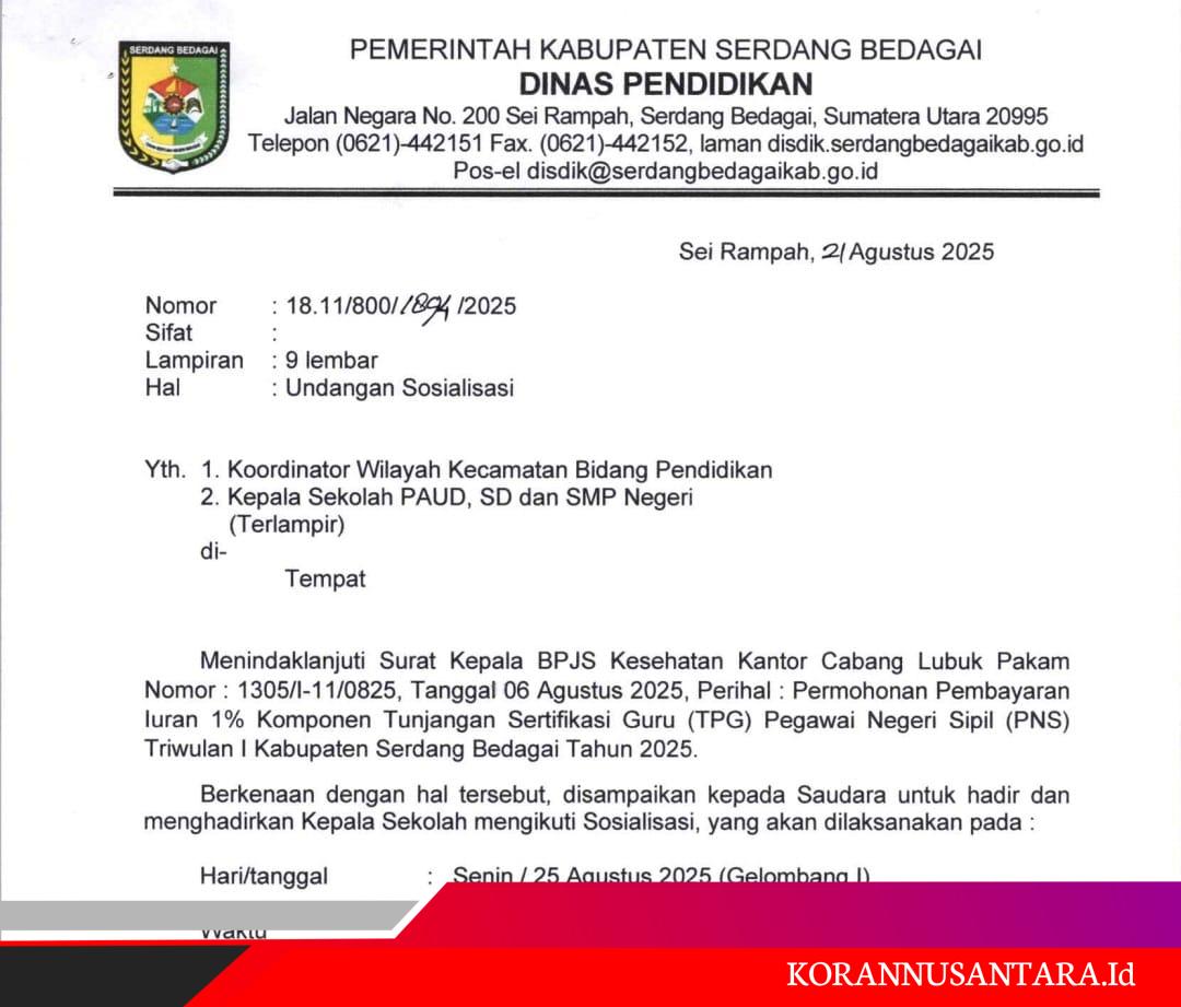 Korannusantara.id, Sergai – Semua guru Pegawai Negeri Sipil (PNS) dan guru yang telah diangkat menjadi Pegawai Pemerintah dengan Perjanjian Kerja (PPPK), Kepala sekolah PAUD, SD, SMP Negeri dan Korwil Kecamatan Bidang Pendidikan, yang bertugas tersebar di Kabupaten Serdang Bedagai (Sergai), Sumatera Utara (Sumut), akan dikumpulkan untuk mengikuti dan mendengarkan penjelasan kegiatan sosialisasi BPJS Kesehatan dari Kantor Cabang Lubuk Pakam Kabupaten Deli Serdang, tentang pembayaran iuran sebesar 1 persen yang diambil dari TPG (Tunjangan Profesi Guru) Triwulan I tahun 2025.