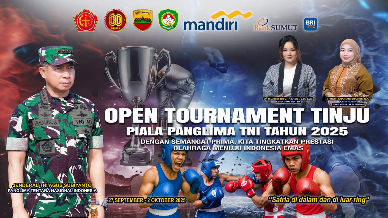 Korannusantara.id – Medan, 27 September 2025, Open Tournament Tinju Piala Panglima TNI Tahun 2025 resmi dibuka pada Sabtu malam di Balai Prajurit Makodam I/Bukit Barisan. Acara pembukaan berlangsung meriah dan dihadiri berbagai pihak, mulai dari jajaran TNI, Pengurus PERTINA, hingga perwakilan sponsor.
