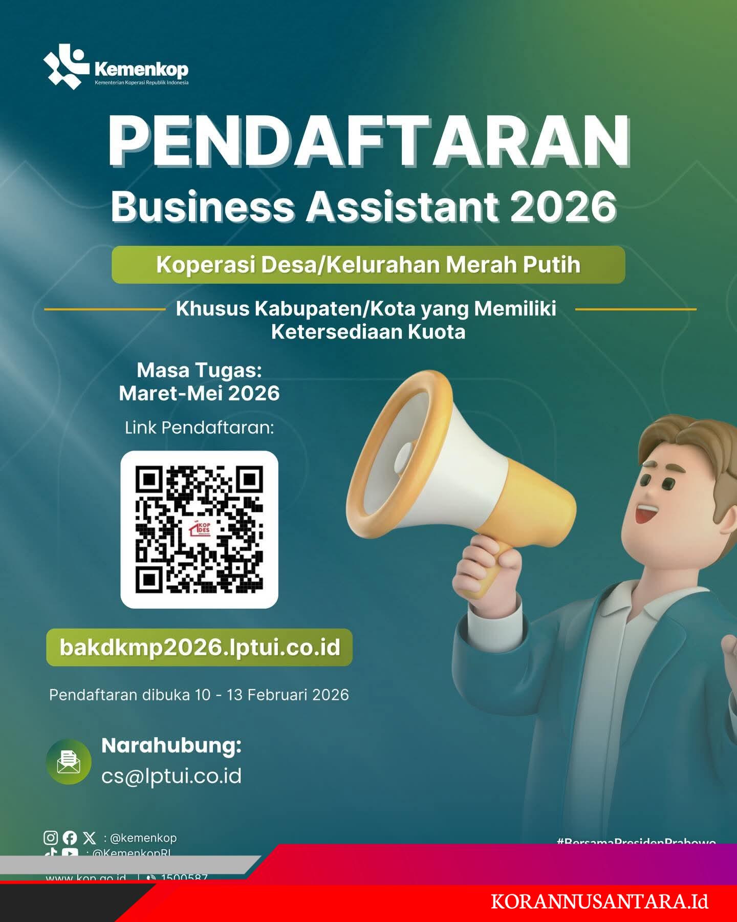 korannusantara.id, Jakarta – Kementerian Koperasi membuka kesempatan untuk bergabung sebagai Bussines Assistant Koperasi Desa/Kelurahan Merah Putih.
