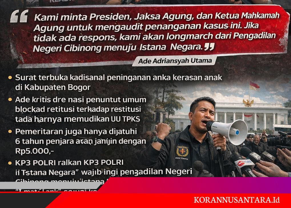 Korannusantara.id – Bogor, 24 Maret 2026, Direktur Eksekutif KP3 Polri, Ade Adriansyah Utama, melayangkan surat terbuka kepada Presiden Republik Indonesia, Prabowo Subianto, terkait dugaan ketidakadilan dalam penanganan kasus kekerasan seksual terhadap anak di Kabupaten Bogor.